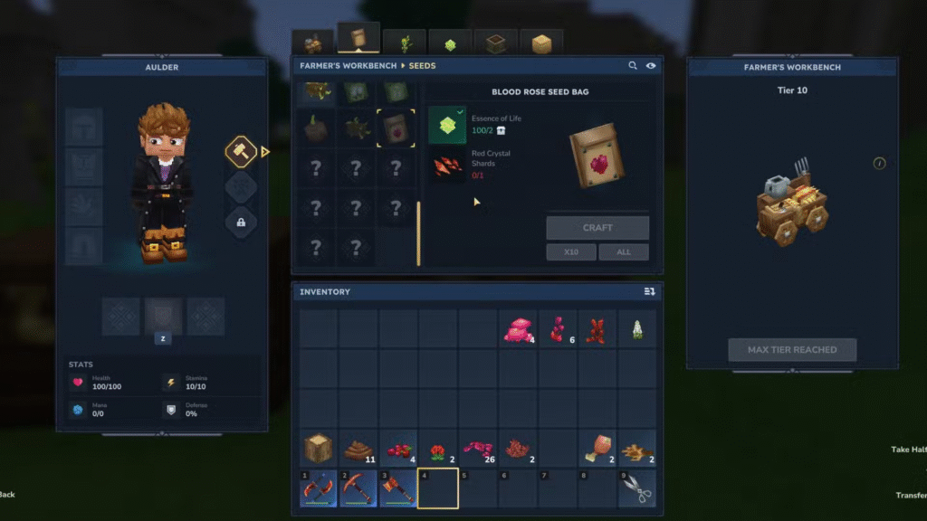 Após aprender a receita, será possível fabricar sementes utilizando materiais específicos. O mais relevante deles é o Fragmento de Cristal Vermelho, um recurso encontrado nas Terras Devastadas (Zona 4), regiões marcadas por solo escurecido, lava exposta e árvores mortas.