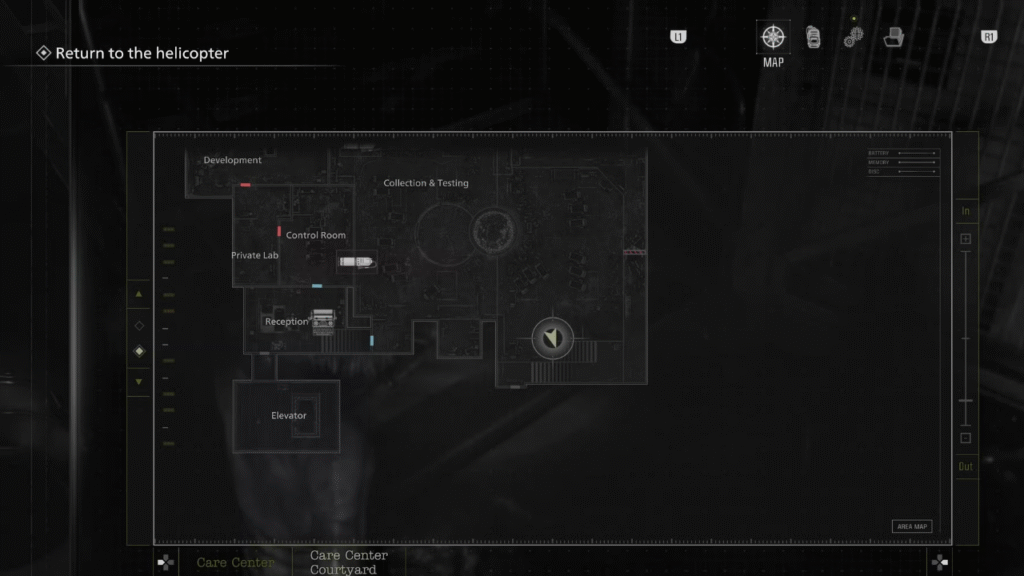 Continue avançando pela história até sair pelo Pátio e chegar ao Centro de Pesquisa. Após obter a Chave do Helicóptero e acionar a fuga da Instalação, o grande frasco de sangue na sala de Coleta e Testes se romperá. Nesse momento, antes de qualquer outra coisa, dirija-se às escadas próximas: a Boneca de Marie estará aguardando no chão, pronta para ser coletada. Deposite a boneca imediatamente na Caixa de Itens dentro do Posto de Guarda e finalize a campanha com ela ainda guardada lá. Sem esse passo, não haverá progressão possível na segunda run.