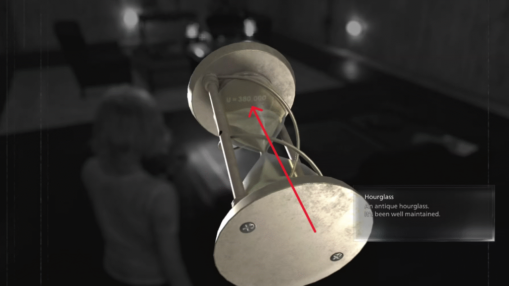 A pista do U exige encontrar uma Ampulheta na Suíte VIP do heliporto, remover os parafusos da parte superior, virá-la de cabeça para baixo e aguardar a areia revelar “U = 380.000” —