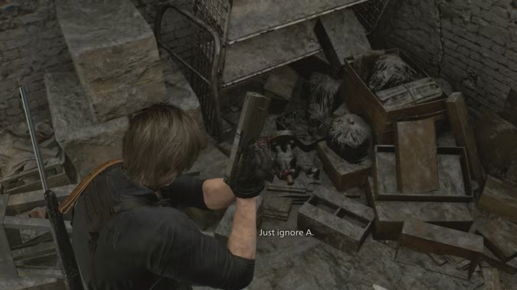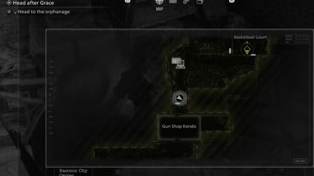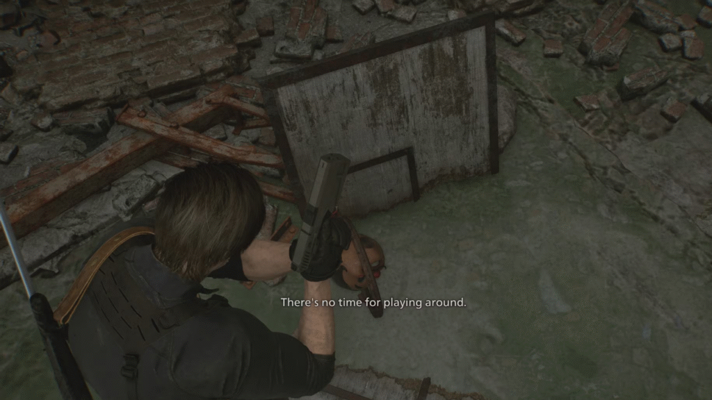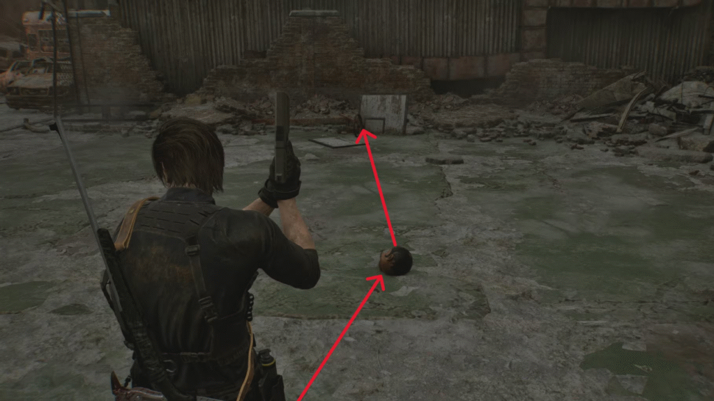 Em Raccoon City, ao jogar como Leon, você encontrará uma figura sem cabeça na loja de armas Kendo. A cabeça do brinquedo está na quadra de basquete próxima, acessível após derrotar o chefe da área. Empurre a cabeça até a cesta de basquete no chão (ao norte) para ouvir um sinal sonoro e ler a mensagem “Não há tempo para brincadeiras”.