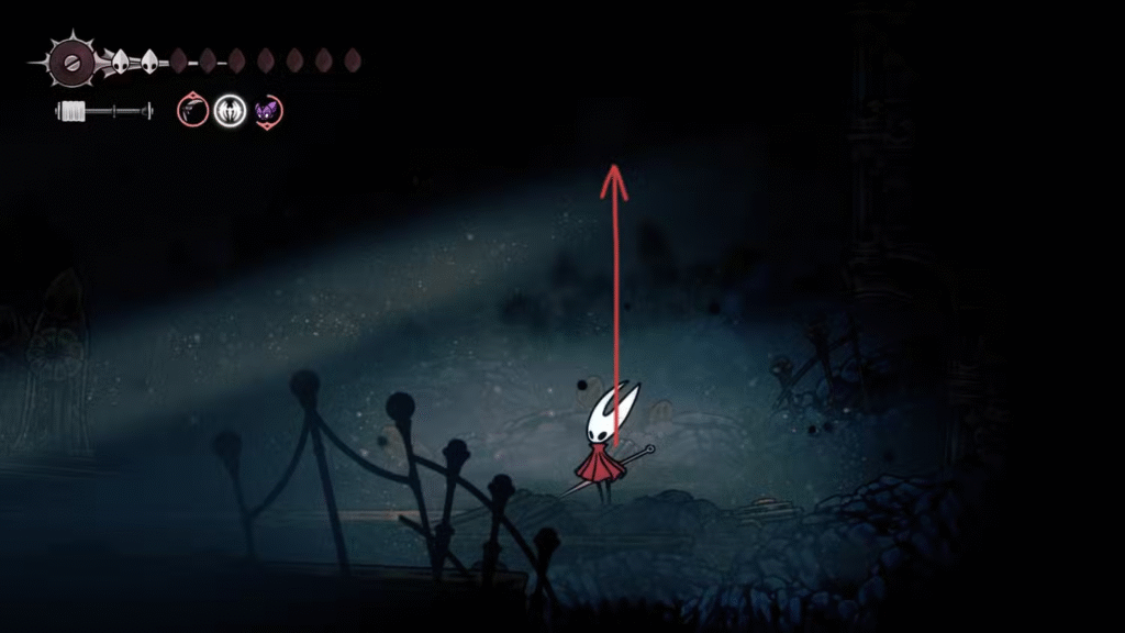 Continue subindo até chegar novamente ao espaço onde Hornet lutou contra Lace antes do confronto final. Use o Voo de Seda sobre a luz da arena para acessar o local.
