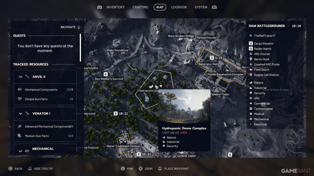 O local mais recomendado atualmente é o Complexo de Domos Hidropônicos, localizado nos Dam Battlegrounds. Trata-se de uma área aberta e relativamente extensa, composta por vários domos que podem ser saqueados individualmente. Essa variedade de estruturas faz com que o local seja ideal para buscas detalhadas.